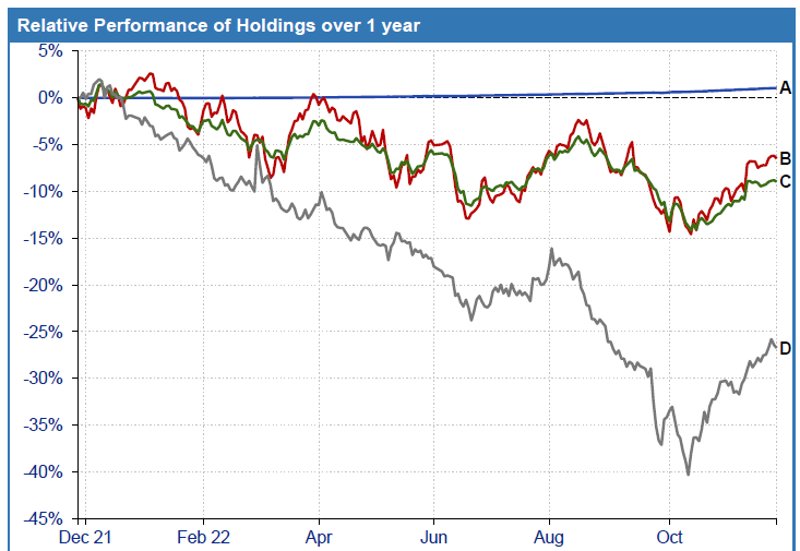The chart represents the different channels of investment in a Lifestyle Fund and the various loss and growth points. Investment in cash, equities and multi-asset funds lost value over the past 10 months, but not at such a rate as the losses seen in the Lifestyle Fund portion of the investment.