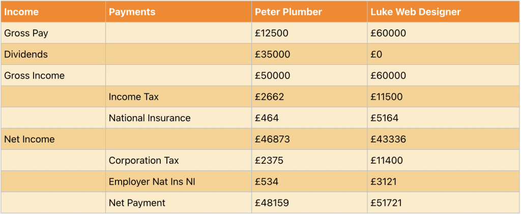 Peter plumber benefits from the lower rate of tax for dividend payments, after corporation tax has been paid and pays less national insurance as his income in the form of salary is less.